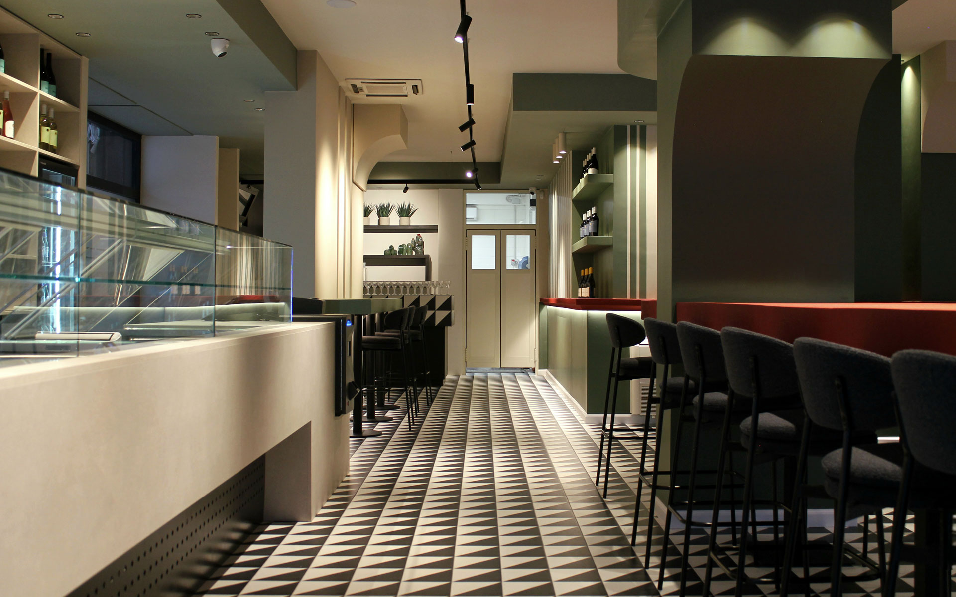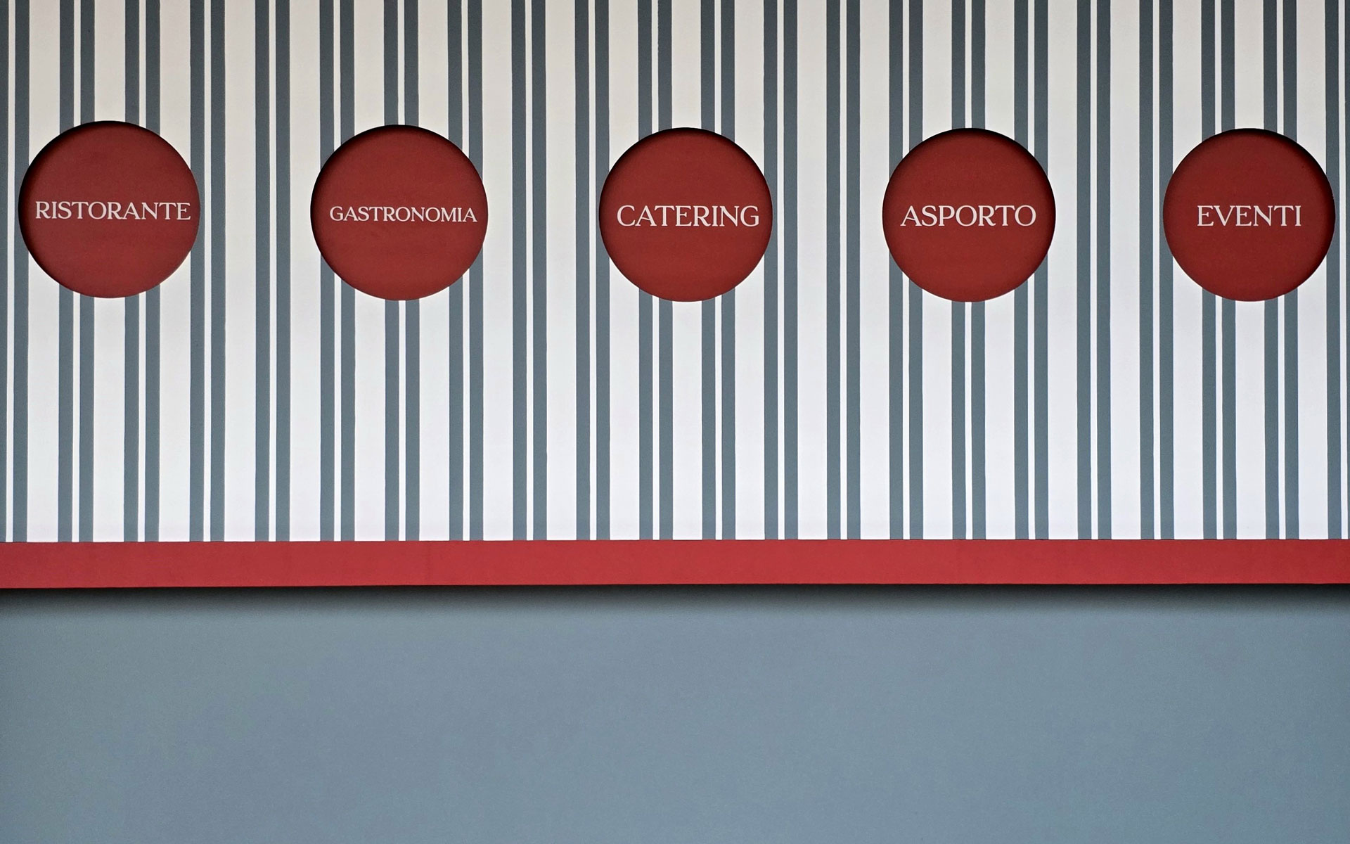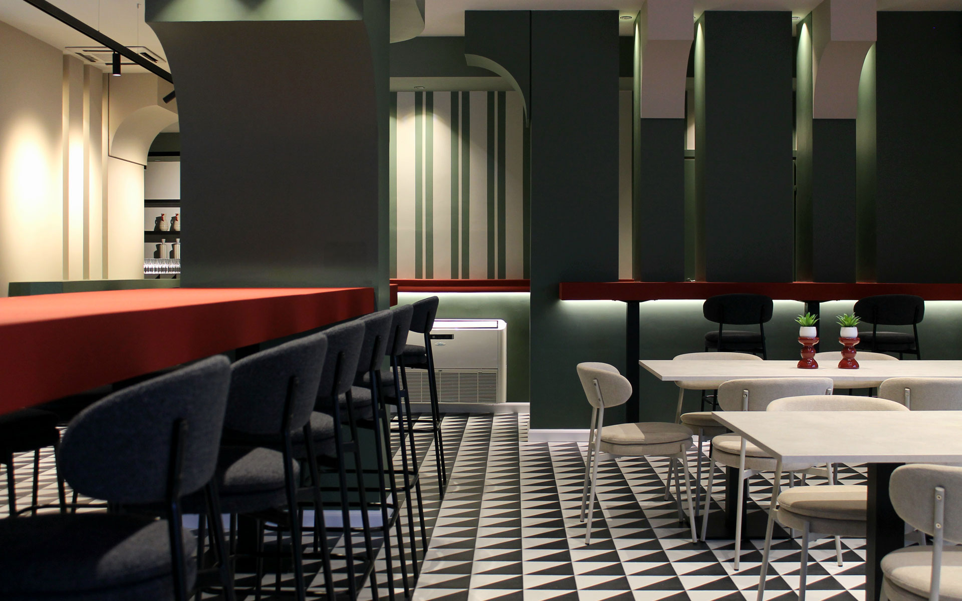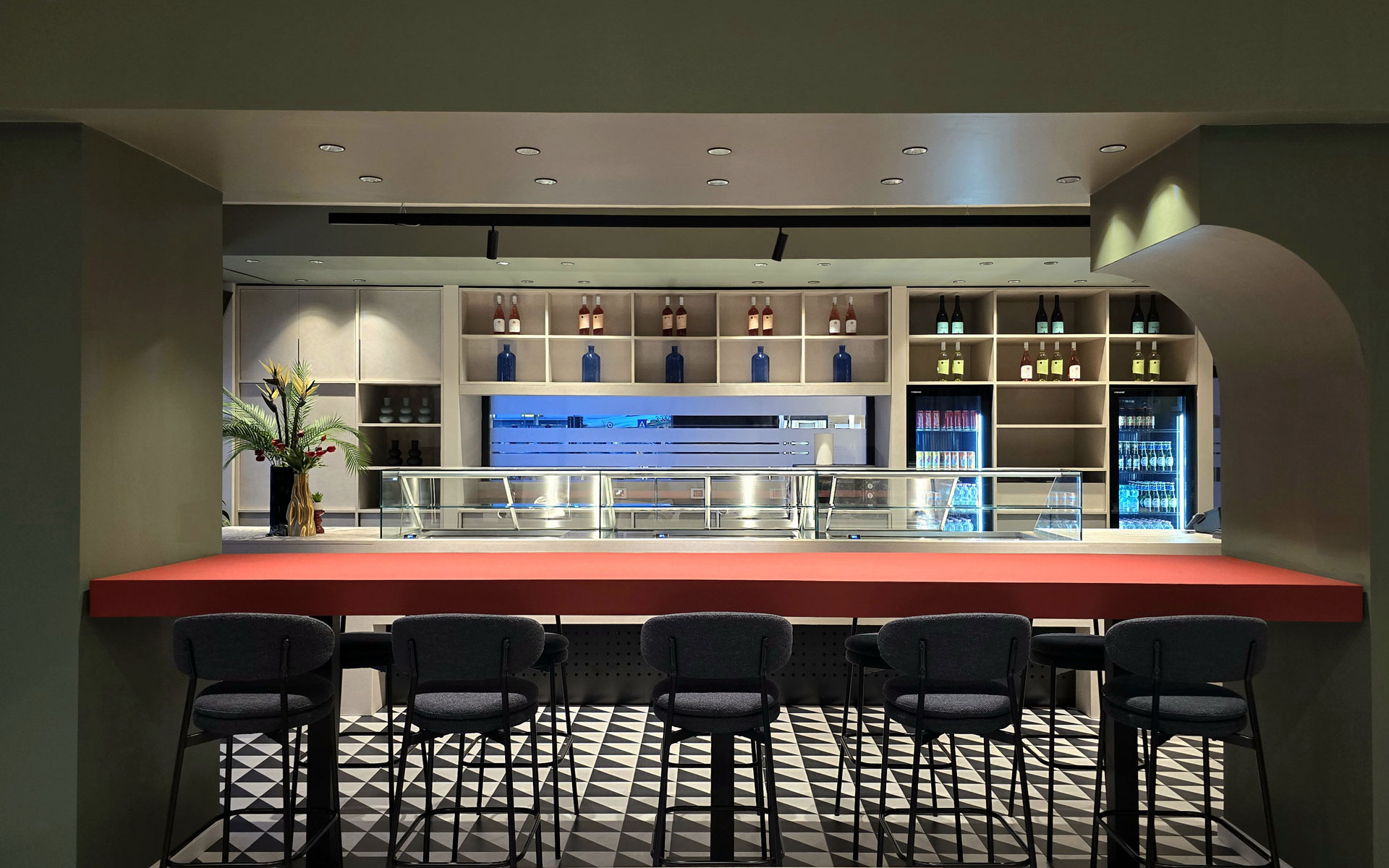 L’intervento si sviluppa a partire da alcuni elementi chiave – superfici grafiche, volumi curvi e cromie decise – che diventano strumenti progettuali capaci di definire carattere e riconoscibilità. Il pavimento introduce un segno grafico netto che accompagna il movimento all’interno dell’ambiente, mentre le forme arrotondate di arredi e banconi addolciscono la composizione e creano un dialogo continuo tra linee e superfici.