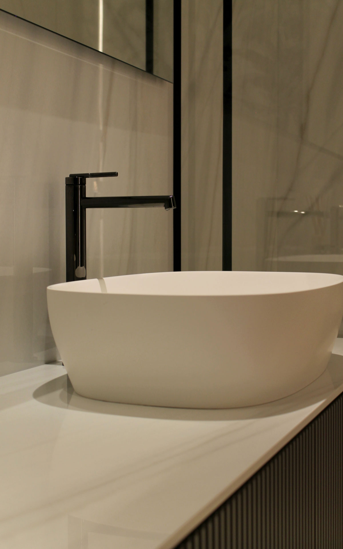 All’esterno, il prospetto alterna rivestimenti in gres porcellanato nei toni del tortora e del marrone, mentre una quinta in color platino riprende le sfumature del cancello d’ingresso, conferendo riconoscibilità e misura all’intervento.