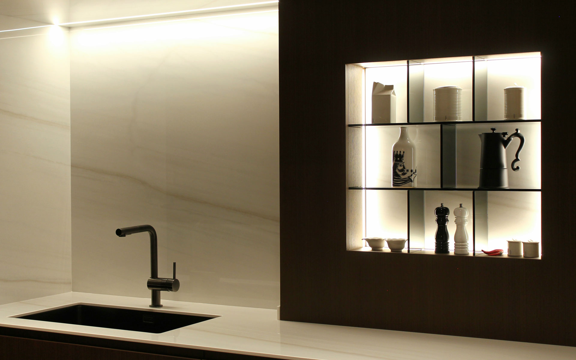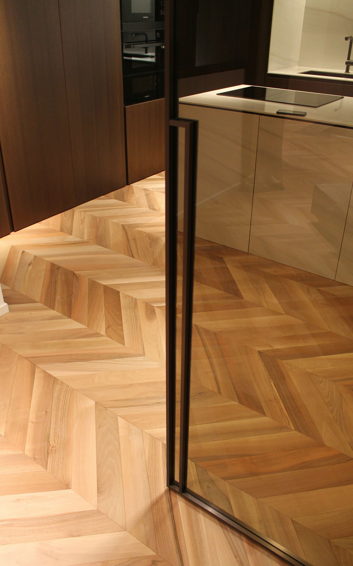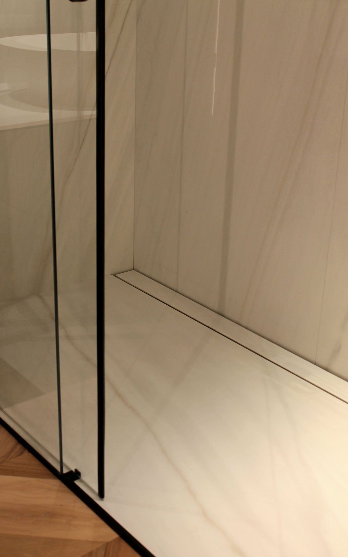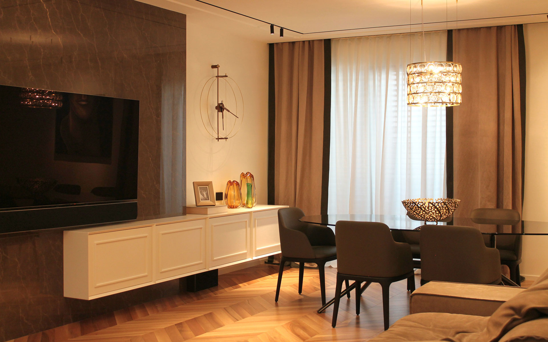 La volontà dei committenti era quella di utilizzare pochi materiali, capaci di creare un fil rouge tra tutti gli ambienti. Il parquet in Noce, ripreso anche in alcuni dettagli d’arredo, unifica gli ambienti in un’unica grammatica visiva; le lastre Ariostea rivestono la cucina realizzata su disegno; mentre il marmo della scala e del setto centrale che collega i piani trova continuità nella zona notte e nei bagni, assicurando una coerenza estetica calibrata.