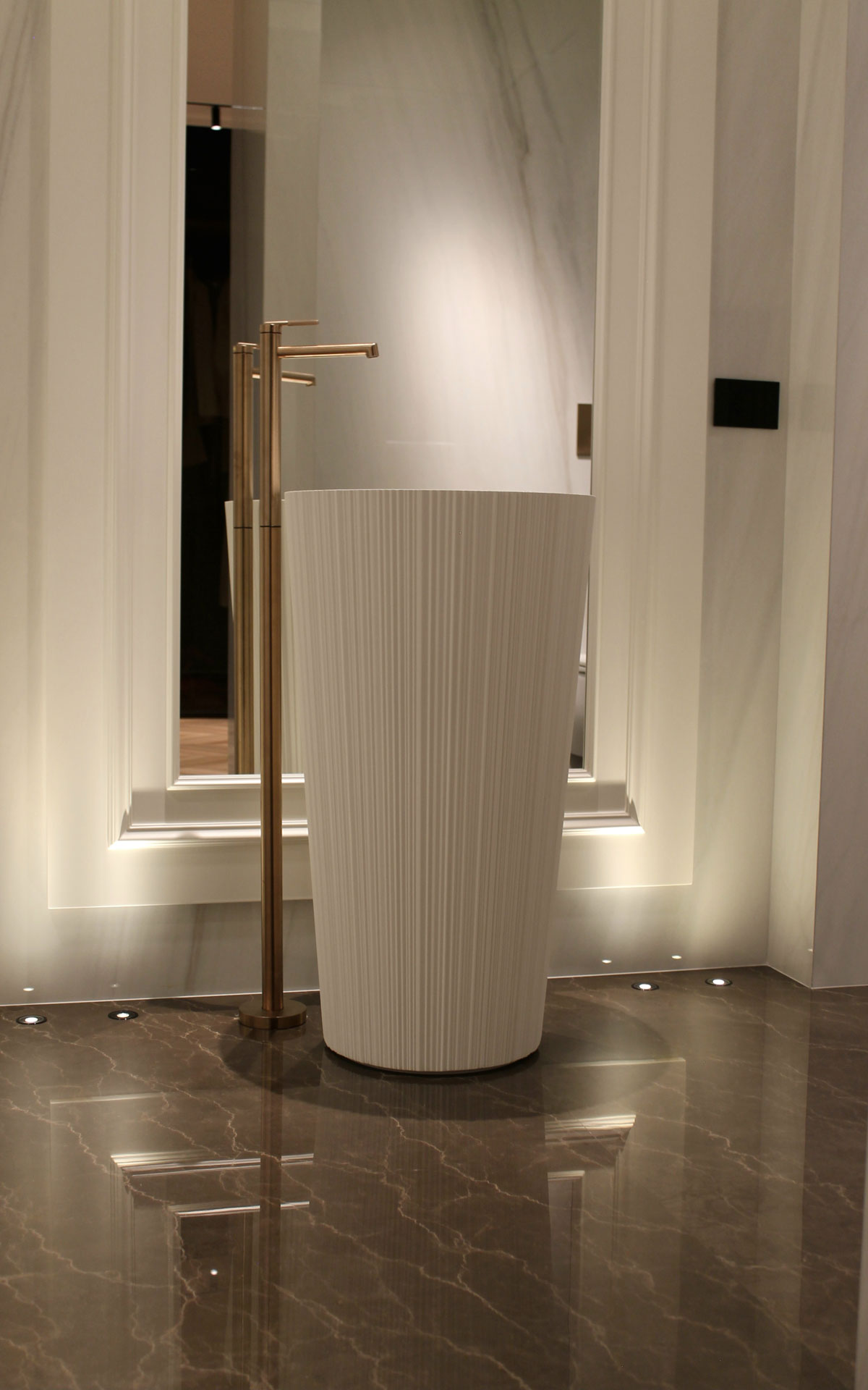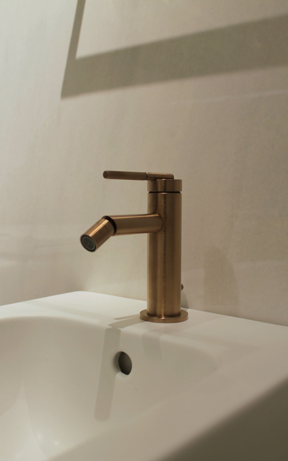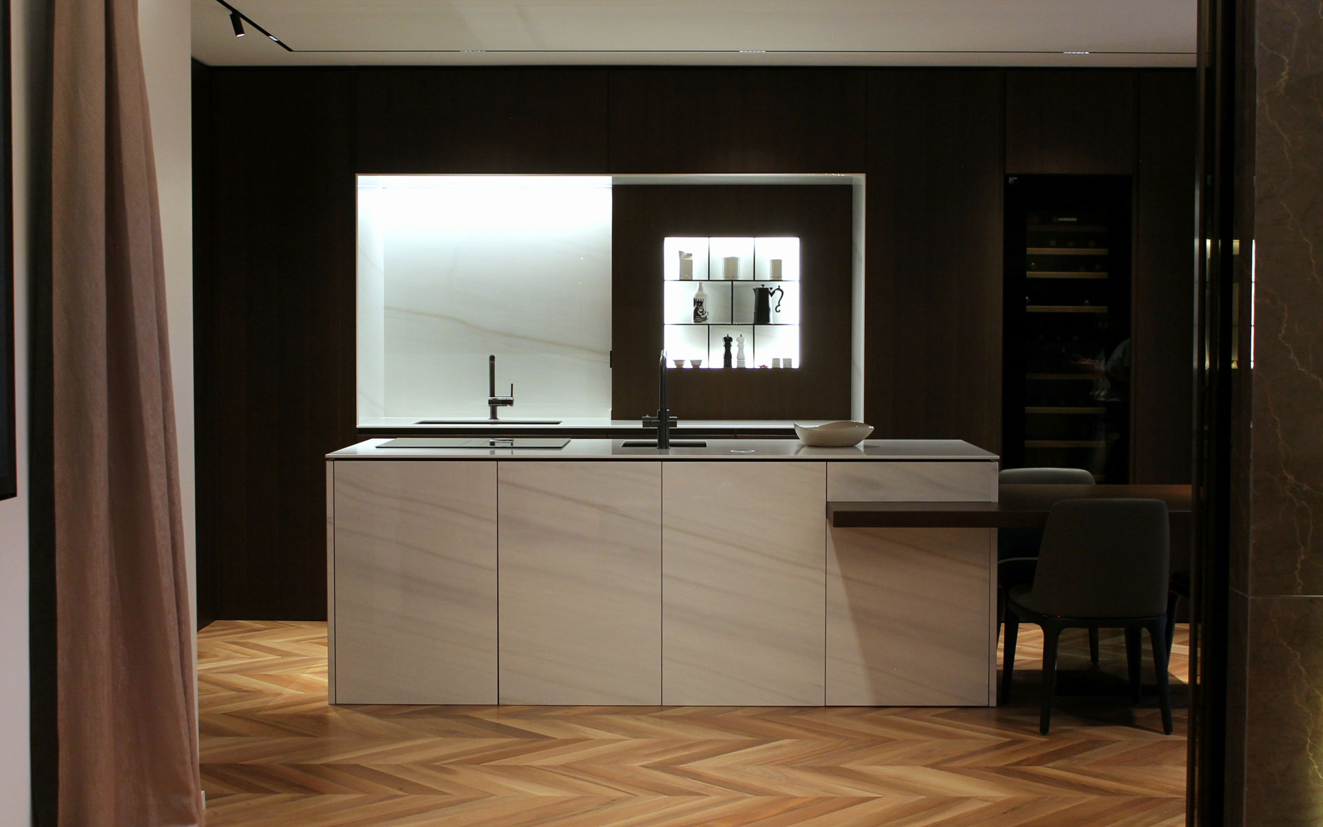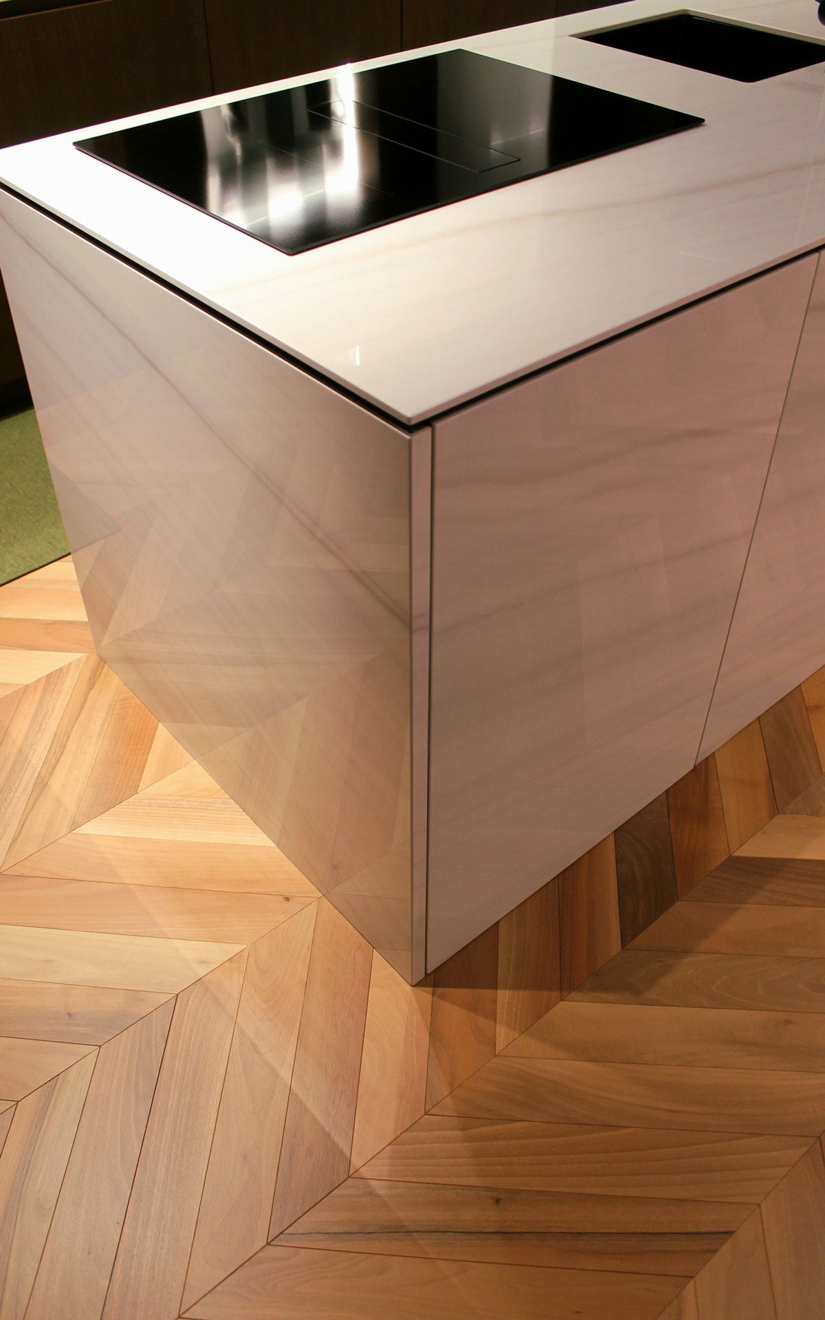 La volontà dei committenti era quella di utilizzare pochi materiali, capaci di creare un fil rouge tra tutti gli ambienti. Il parquet in Noce, ripreso anche in alcuni dettagli d’arredo, unifica gli ambienti in un’unica grammatica visiva; le lastre Ariostea rivestono la cucina realizzata su disegno; mentre il marmo della scala e del setto centrale che collega i piani trova continuità nella zona notte e nei bagni, assicurando una coerenza estetica calibrata.